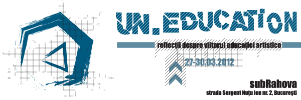 Va invitam la seria de ateliere, prezentari si conferinte din cadrul proiectului UN-EDUCATION. Reflectii despre viitorul educatiei artistice care va avea loc in perioada 27-30 martie 2012 la subRahova, str. Sergent Nutu Ion nr. 2, Bucuresti.